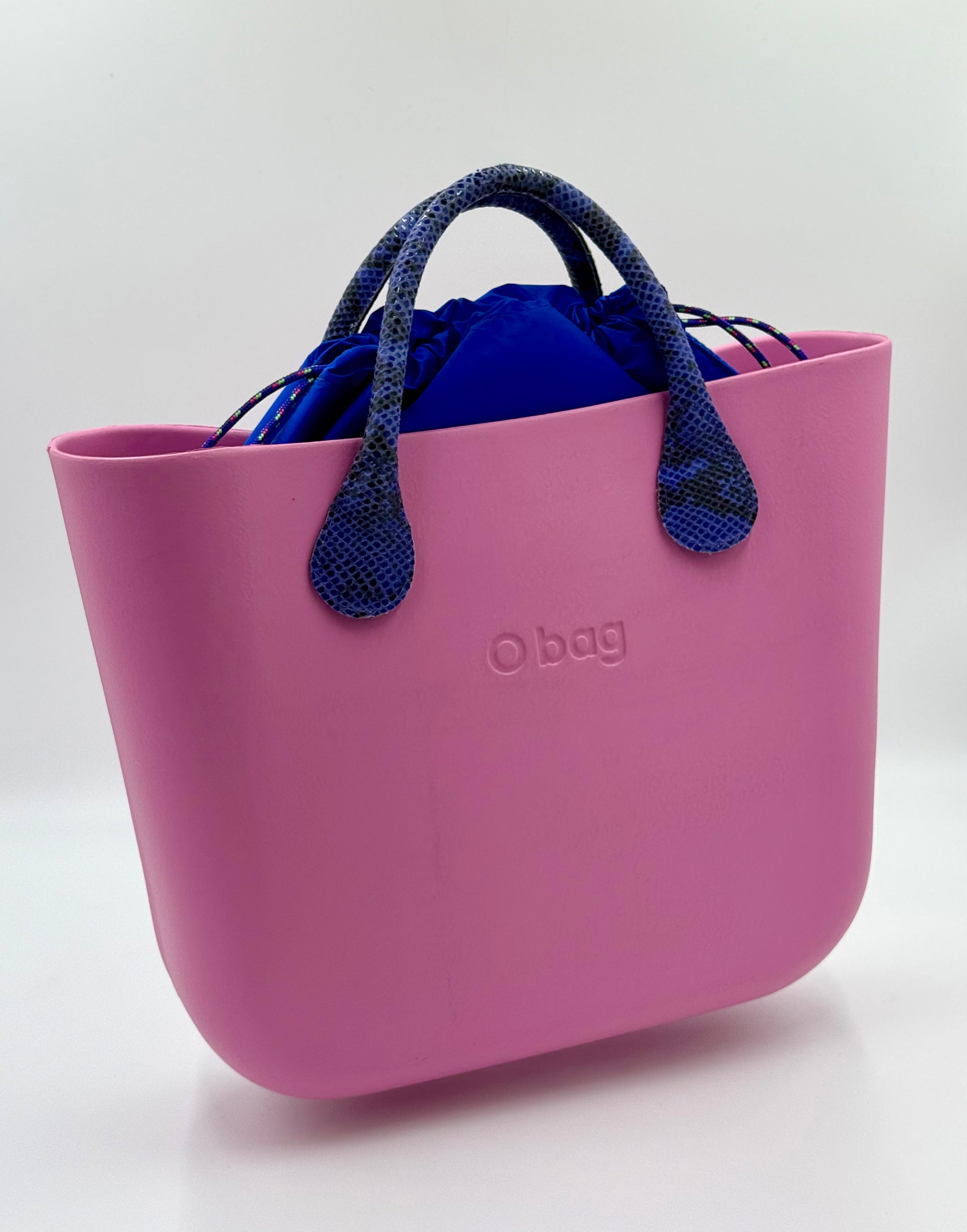 O bag – malvenfarbene Tasche mit blauem Innensack und Griffen in Schlangenoptik